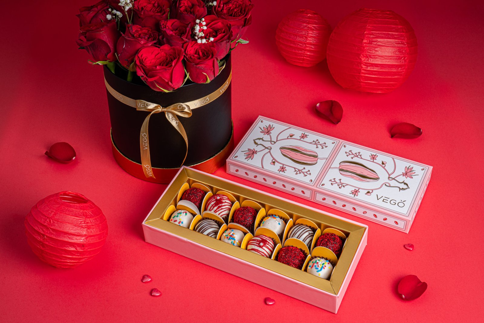 Selected Valentine’s gifts can be paired with a separate box of fresh roses for a classic flowers-and-desserts combination.