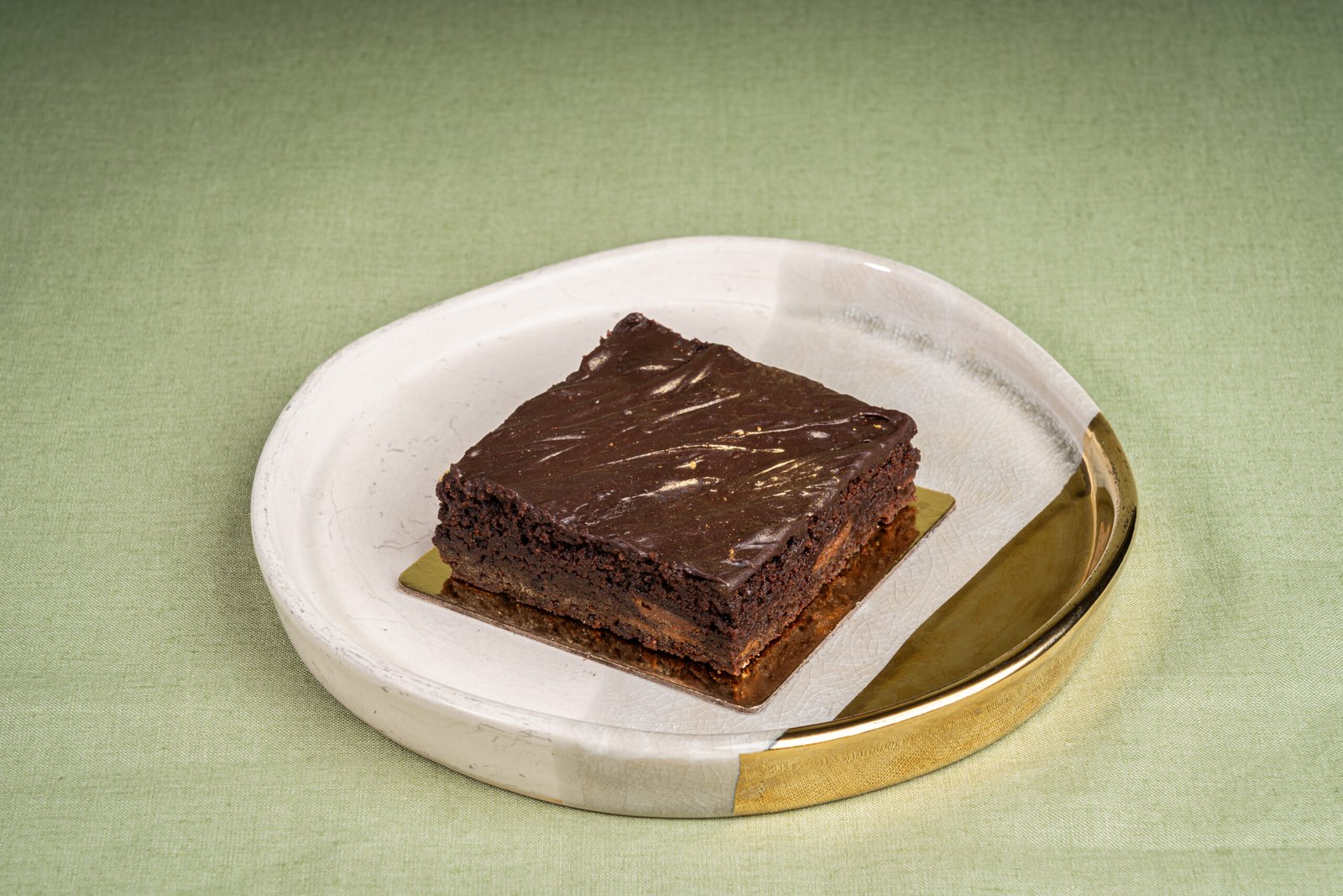 rich chocolate brownie with a crisp top and soft fudgy brownie ,toppped with rich dark chocolate ganache.