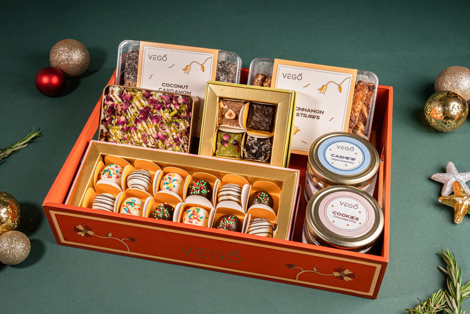 A classic christmas curation celebrating warmth, flavour, and festivity. – Truffles Box Of 12 , Brownie Box Of 4 , Chocolate Nutella Pound Cake , Coconut Cardamom Biscotti , Cinnamon Straw , Chocolate Chip Cookie , Maple Rosemary Cashew