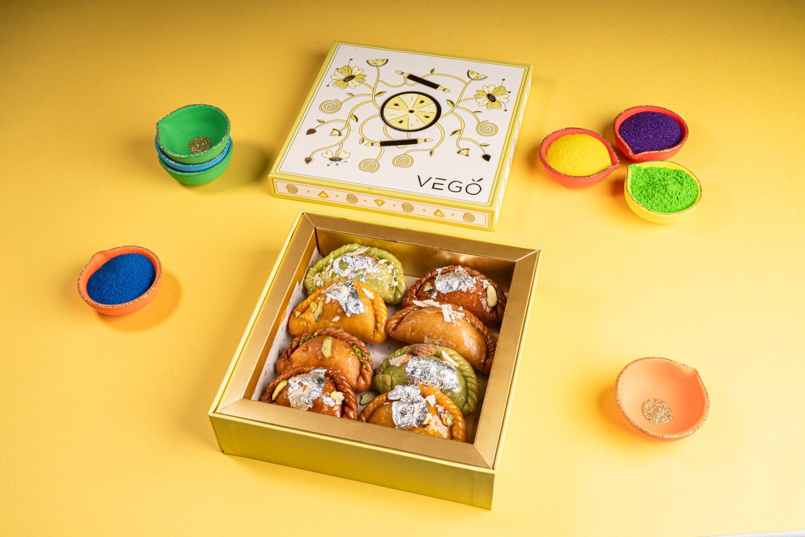 “Traditional crescent-shaped pastries filled with rich khoya and nuts, fried until golden. A timeless Holi specialty known for its balanced sweetness and comforting flavors.