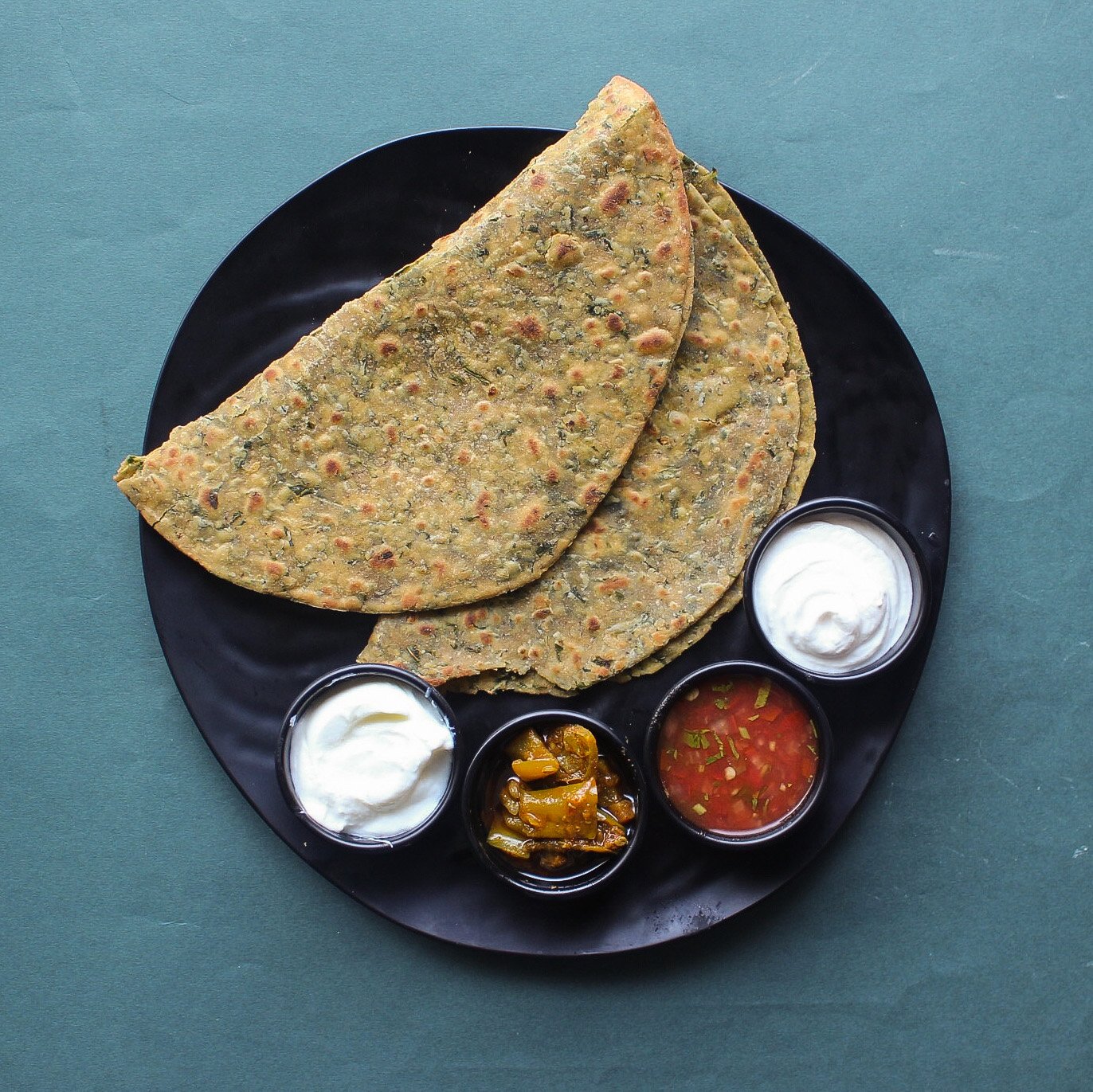 Kale and onion paratha served with tomato salsa, sour cream, pickle, and yogurt