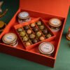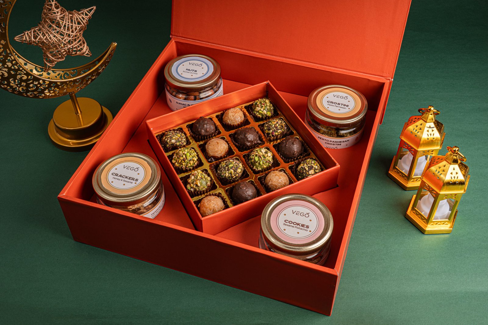 Indulgent in the radiance of Ramadan with this exquisite collection of handcrafted delights. Featuring :- 16 Pcs. Truffle , Honey Sesame Crackers , Sumac Chilli Nuts, Sesame Pistachio Cookie , Pesto Crostini
