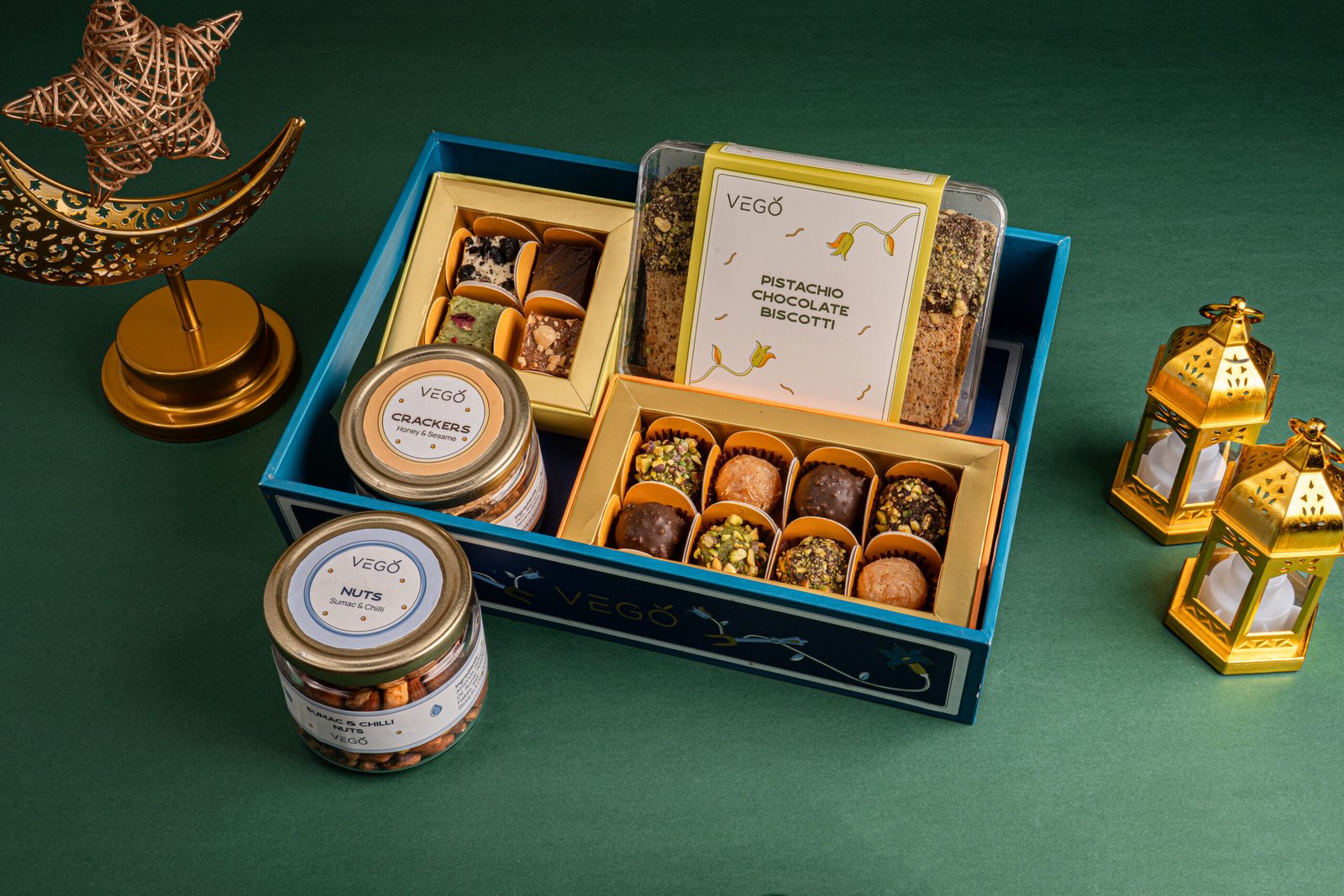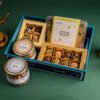 “A Charming assortment of artisanal chocolates ,biscotti, and gourmet jars.- Featuring :- 8 Pcs Truffle , 4 Pcs Brownie , Pistachio Chocolate Biscotti , Honey Sesame Crackers , Sumac Chilli Nuts”
