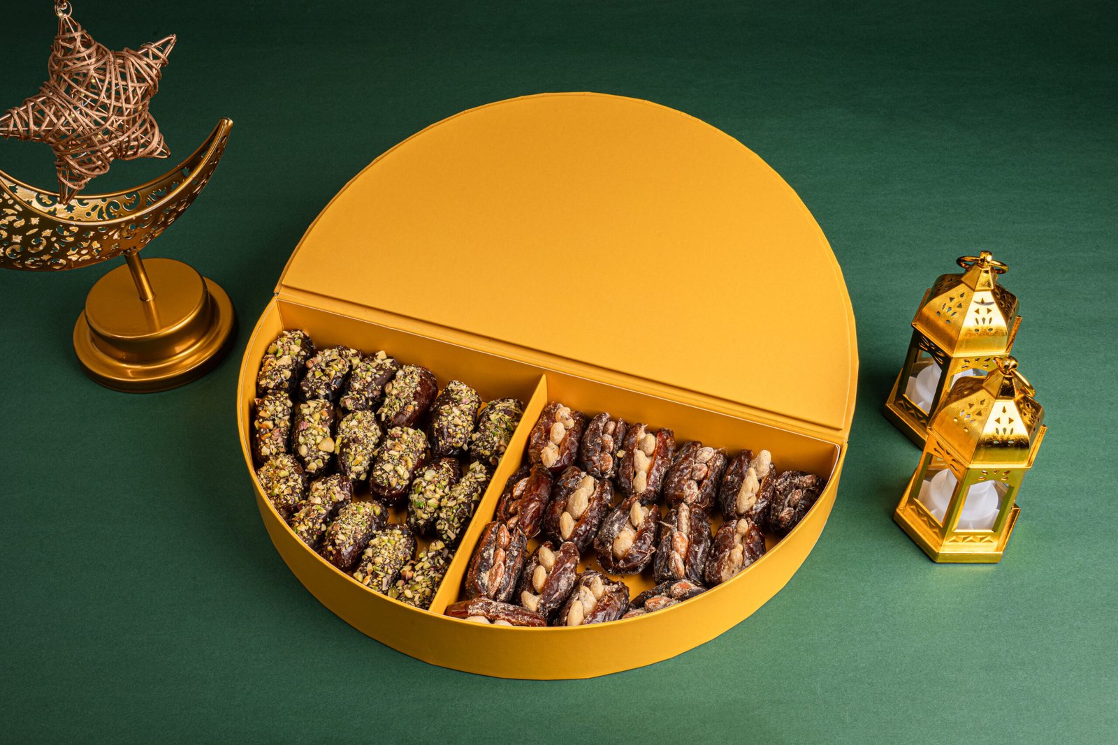 Chocolate Dipped Pistachio Dates Soft dates dipped in chocolate and coated with crushed pistachio.