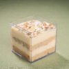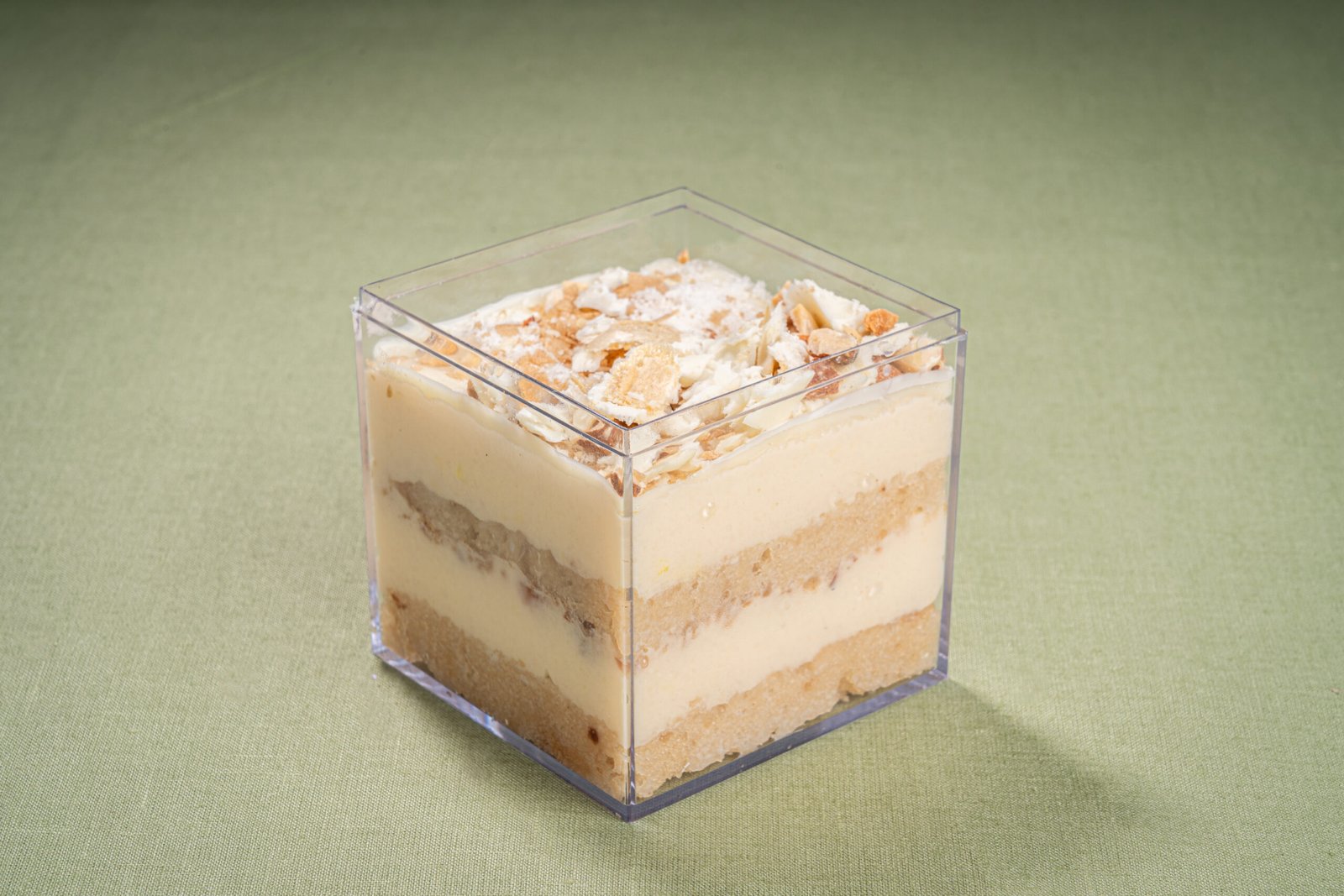 Soft vanilla sponge soaked in milk, layered with creamy coconut cheese mix, French biscuits, and roasted almonds, covered with a delicate layer of white chocolate