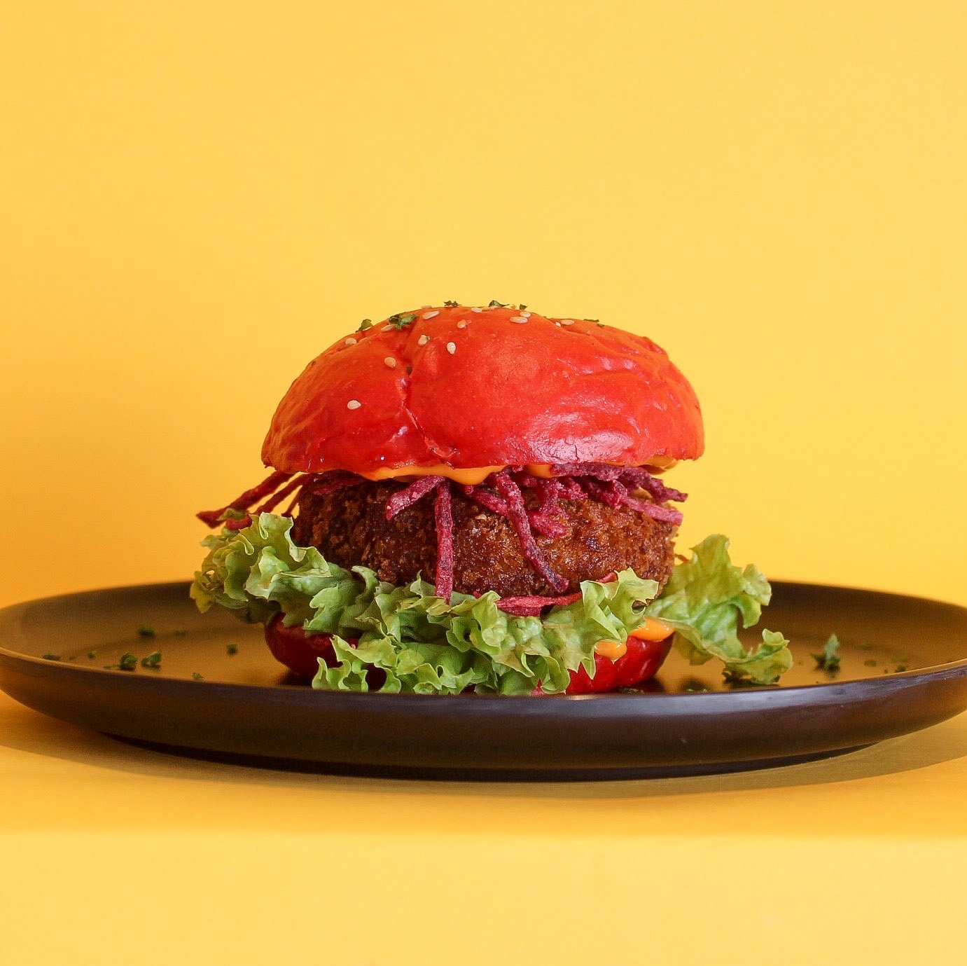 Sweet potato & quinoa patty with feta, harissa, crispy beetroot shavings on a beetroot bun