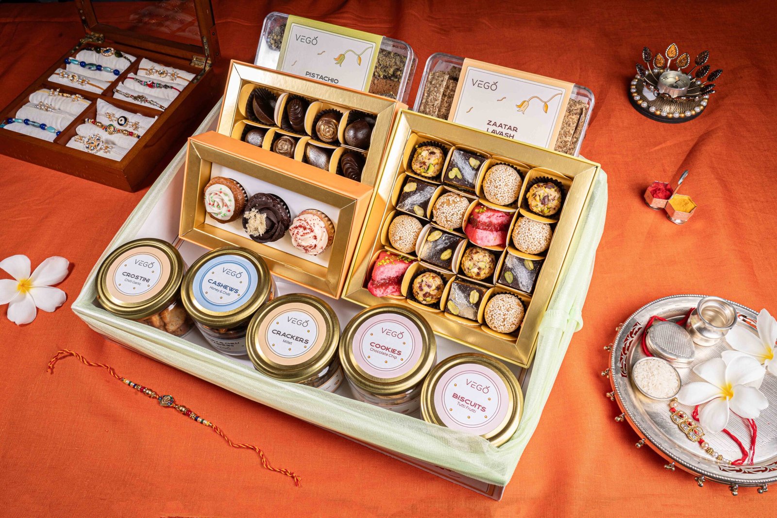 Box Of 16 Mithai , Box Of 8 Chocolate , Box Of 3 Cupcake , Pistachio Chocolate Biscotti , Zaatar Lavash , Millet Crackers , Honey Chilli Cashew , Chilli Garlic Crostini , Chocolate Chip Cookie , Tutti Frutti Biscuits , Rakhi”