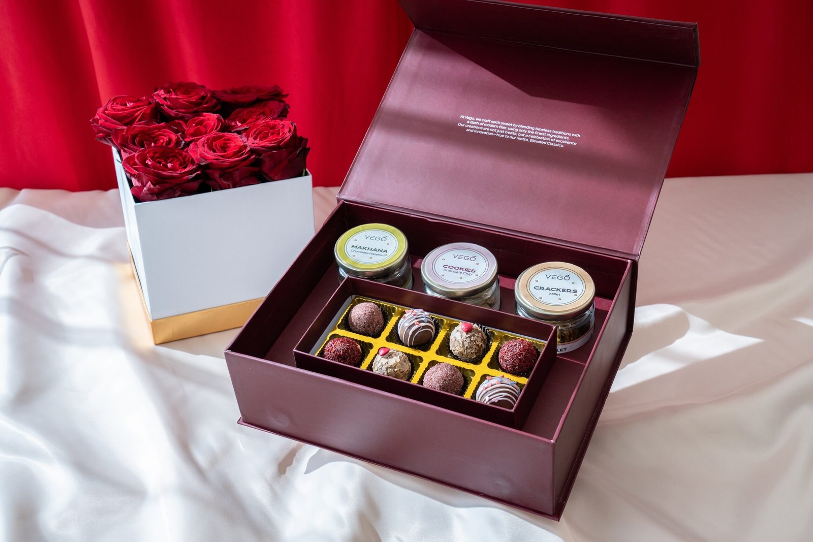 “Truffles, snacks, and 9 red roses—perfect for a sweet and simple Valentine’s gift With Chocolate Hazelnut Makhana
