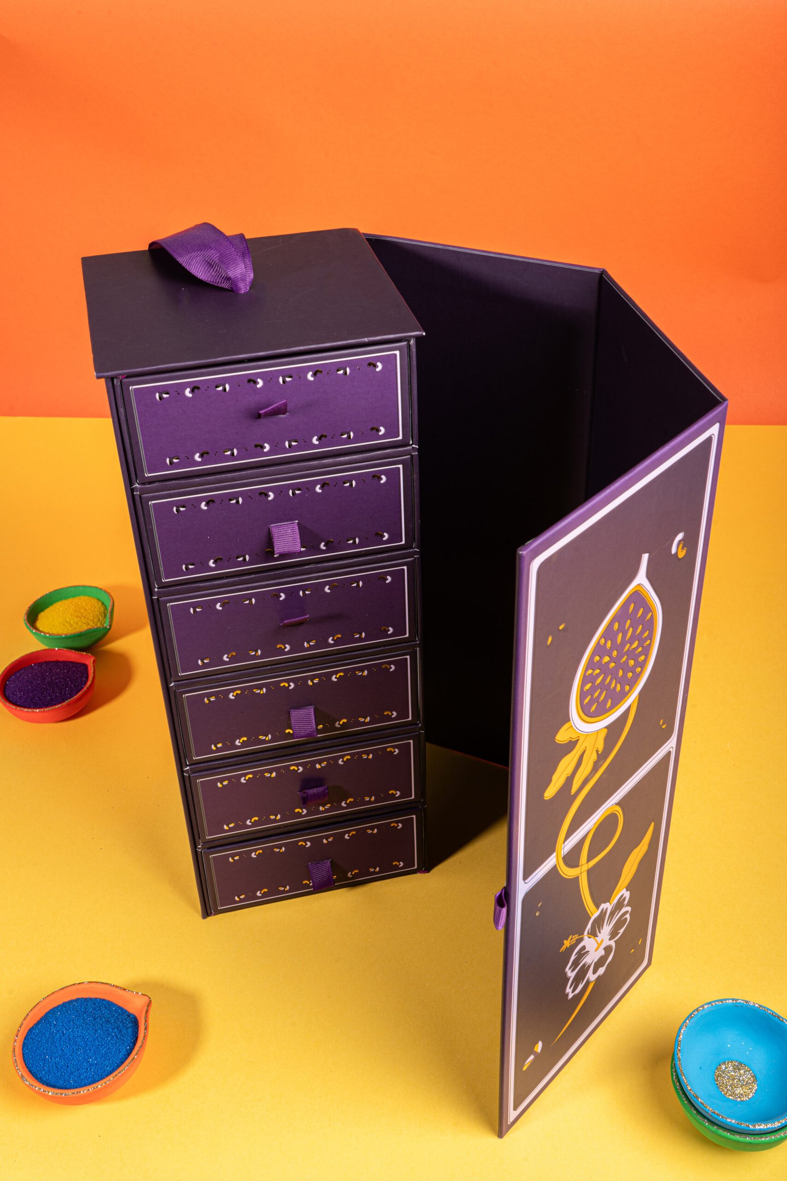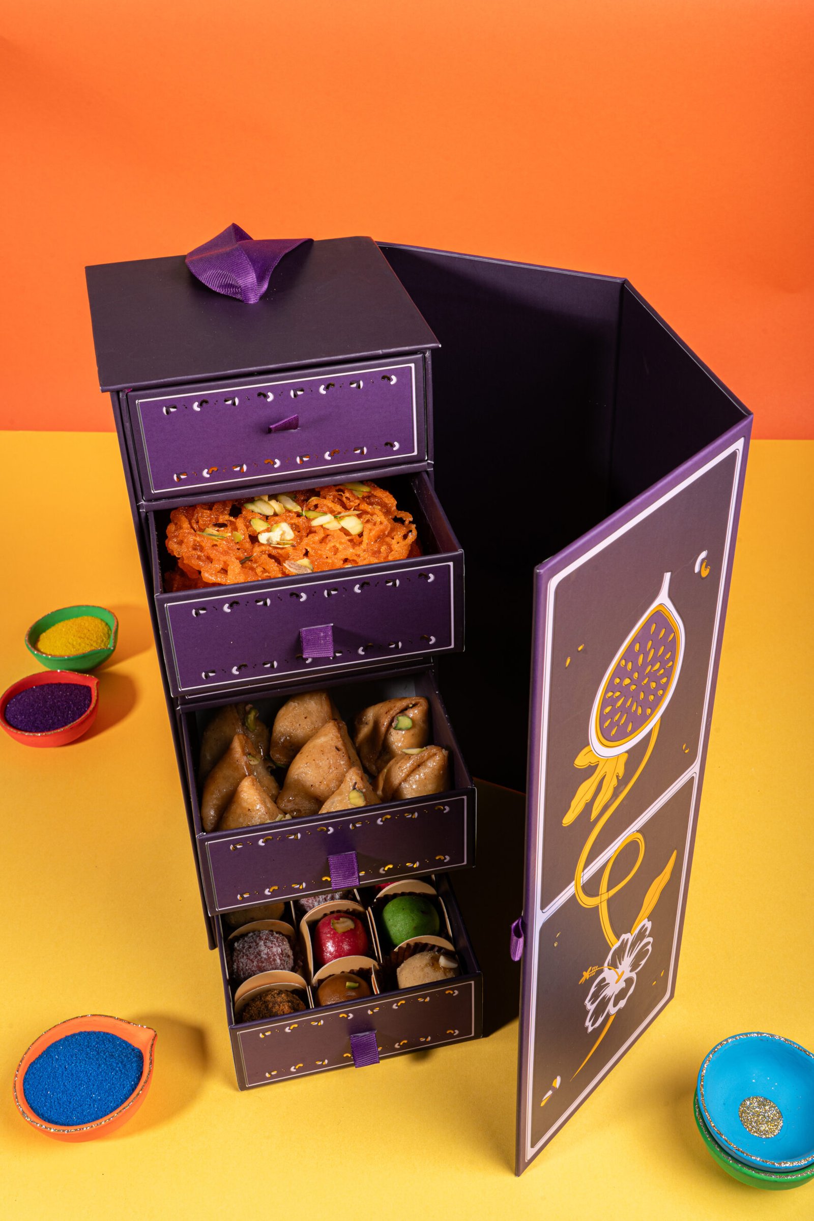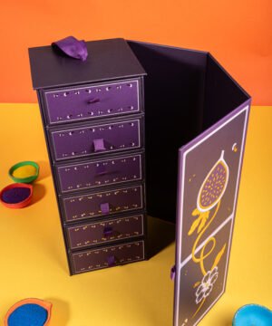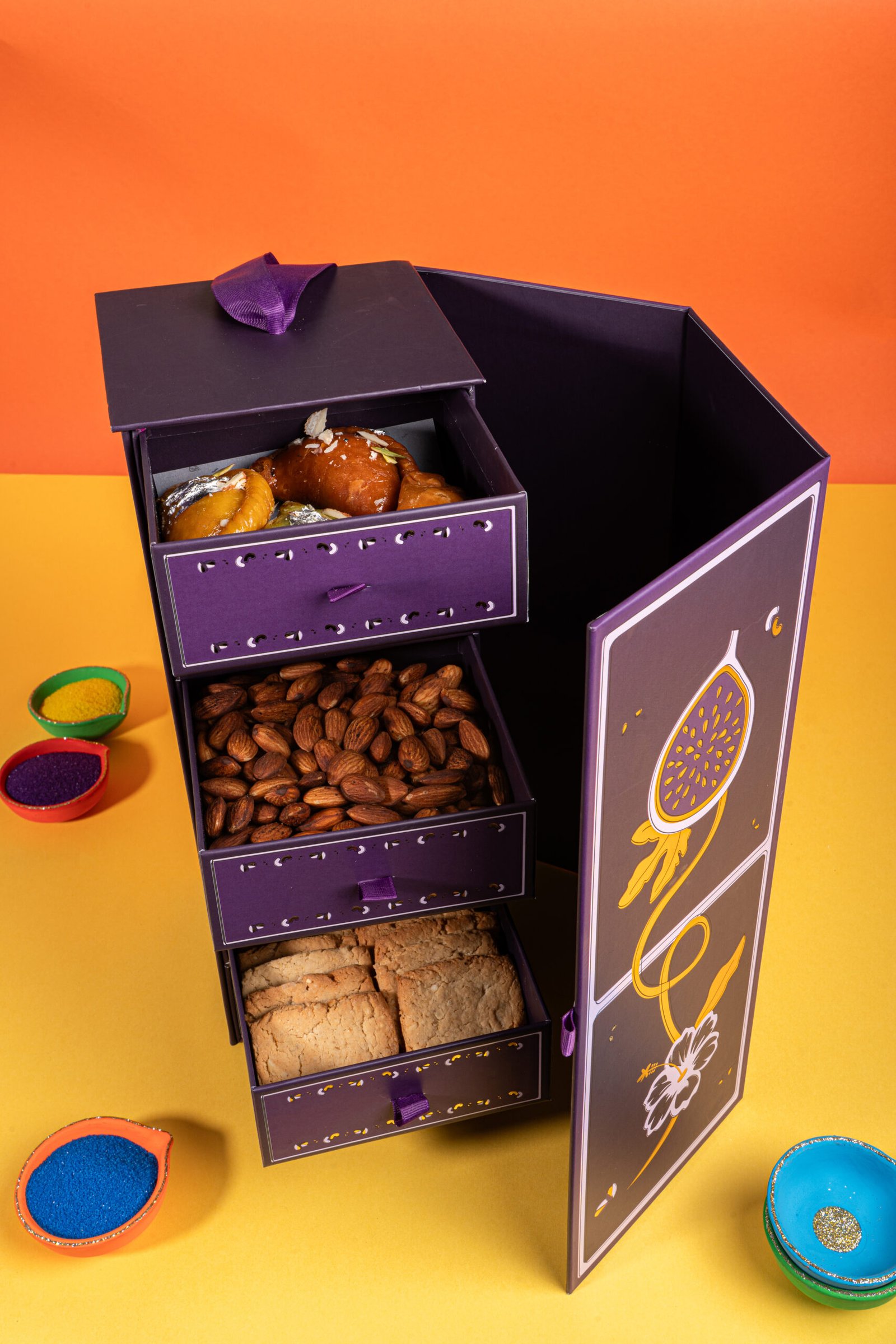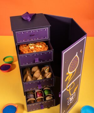 This festive ensemble beautifully layers classic indulgences like delicate Gujiya, regal Ghevar, and rich, syrupy Gheeyar, complemented by savoury delights including aromatic Fennel & Jeera Mathri and wholesome Sattu Almond Biscuits. Finished with the refined crunch of Rose Salt & Pepper Almonds.